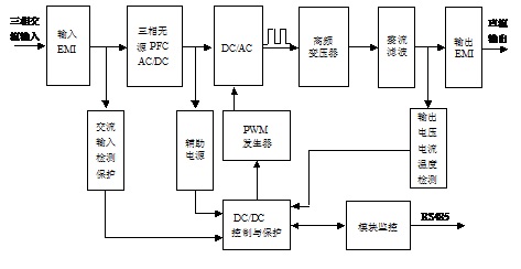 HD22010-3充电模块由三相无源PFC和DC/DC两个功率部分组成。在两功率部分之外还有辅助电源以及输入输出检测保护电路。HD22010-3充电模块前级三相无源PFC电路由输入EMI和三相无源PFC组成,用以实现交流输入的整流滤波和输入电流的校正,使输入电路的功率因素大于0.92,以满足DL/T781-2001中三相谐波标准和GB/T 17794.2.2-2003中相关EMI、EMC标准。后级的DC/DC变换器由PWM发生器控制前级PFC输出的DC电压、经过高频变压器输出后再整流滤波输出DC电压等电路组成,用以实现将前级整流电压转换成电力操作系统要求的稳定的直流电压输出。HD22010-3充电模块辅助电源在输入三相无源PFC之后,DC/DC变换器之前,利用三相无源PFC的直流输出,产生控制电路所需的各路电源。HD22010-3充电模块输入检测电路实现输入过欠压、缺相等检测。DC/DC的检测保护电路包括输出电压电流的检测,散热器温度的检测等,所有这些信号用以DC/DC的控制和保护。