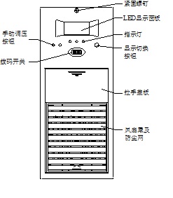 HD22010-3模块拉手隐藏在盖板后面。将盖板向下平移,就会露出模块拉手。HD22010-3模块工作时应将拉手盖板恢复到图1-1位置,否则将影响模块的散热。风扇罩用于防止外部物件被风扇吸入充电模块中造成模块损坏。防尘网用于过滤灰尘以延长模块寿命。
